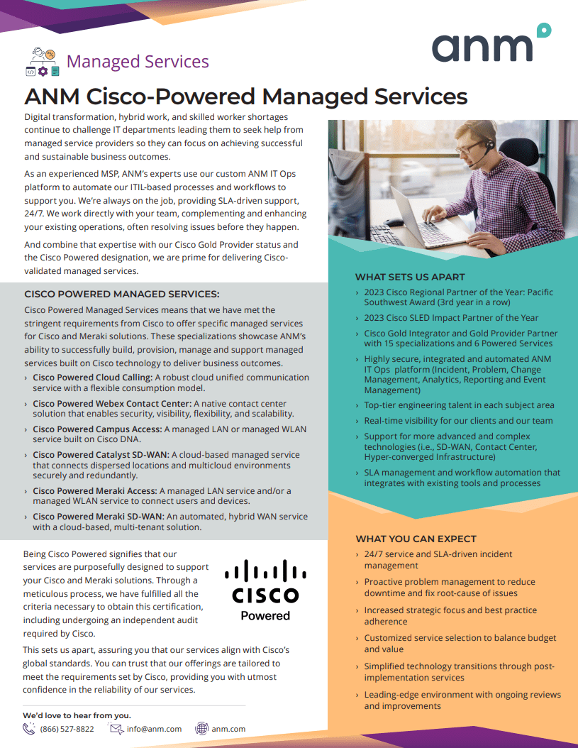 Cisco Powered Managed Services means that we have met the stringent requirements from Cisco to offer specific managed services for Cisco and Meraki solutions. These specializations showcase ANM’s ability to successfully build, provision, manage and support managed services built on Cisco technology to deliver business outcomes.