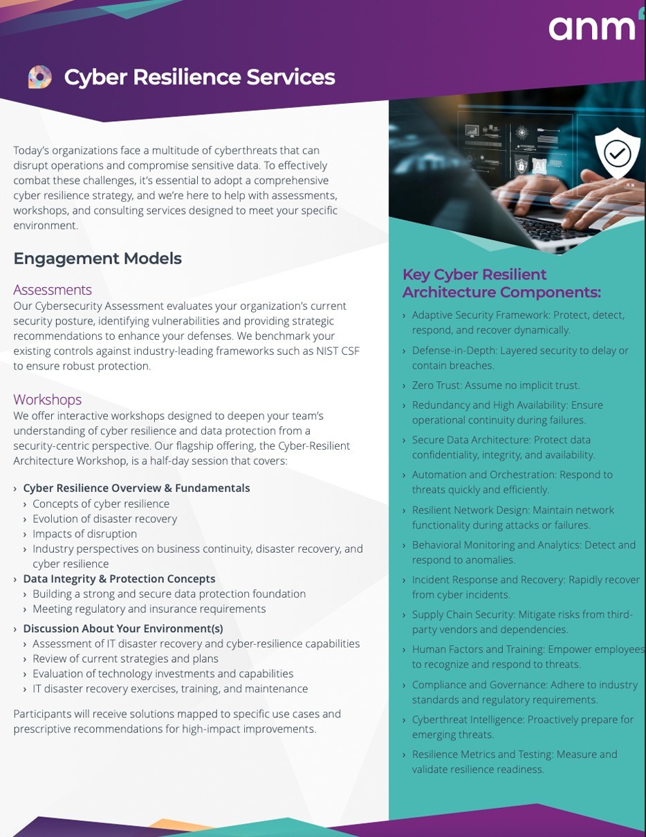 Today’s organizations face a multitude of cyberthreats that can disrupt operations and compromise sensitive data. To effectively combat these challenges, it’s essential to adopt a comprehensive cyber resilience strategy, and we’re here to help with assessments, workshops, and consulting services designed to meet your specific environment.